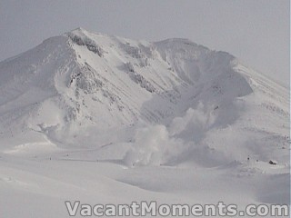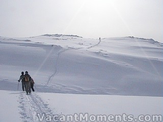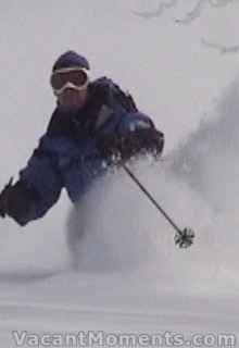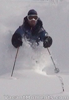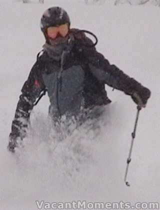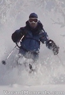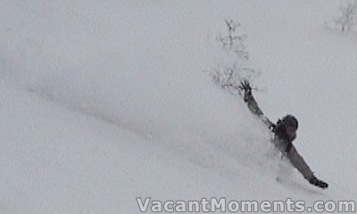 The best off piste conditions were accessed by a 20-minute climb and traverse from the top of the lift. From here we had a choice of reasonably long and steep chutes and ridge lines. The other alternative, with only the usual climb towards one of the piste runs took us into a small bowl. Although not steep down the middle it was enjoyable in knee deep fresh. Dropping in from the right side of the bowl off a ridge line provided a few steep turns.